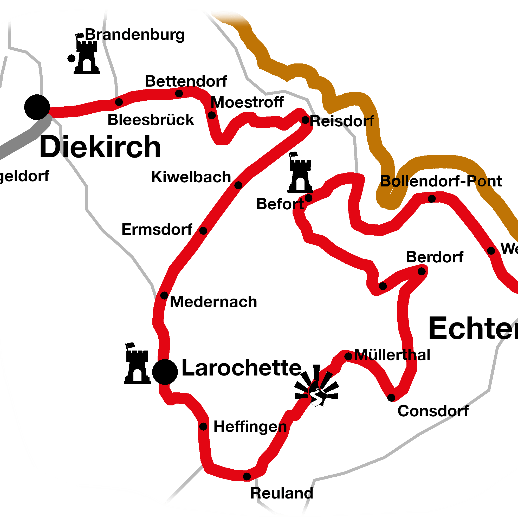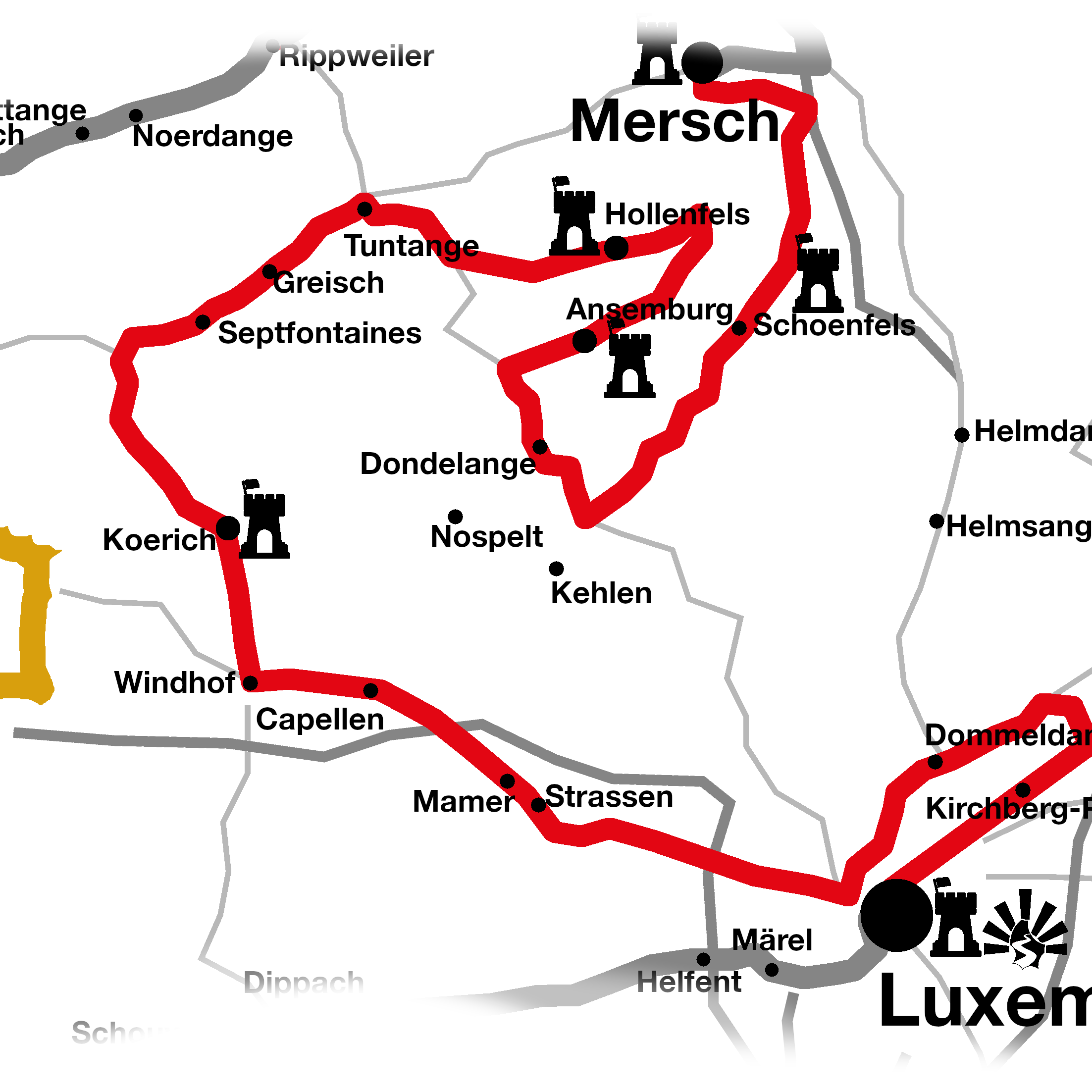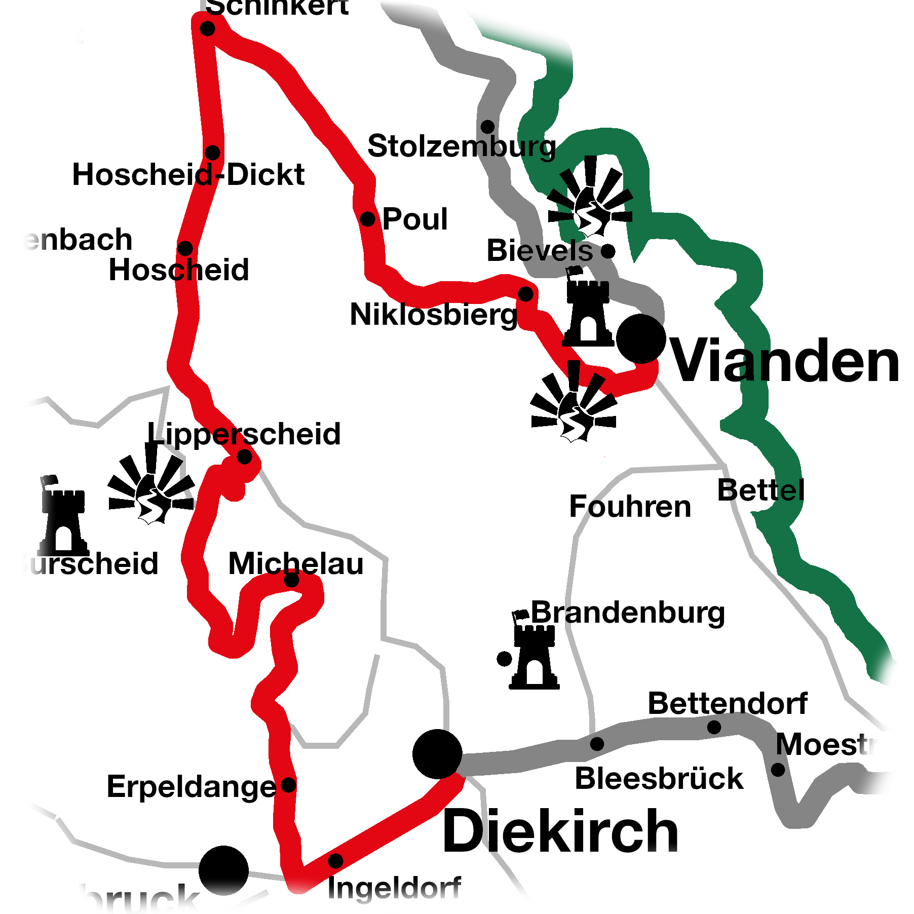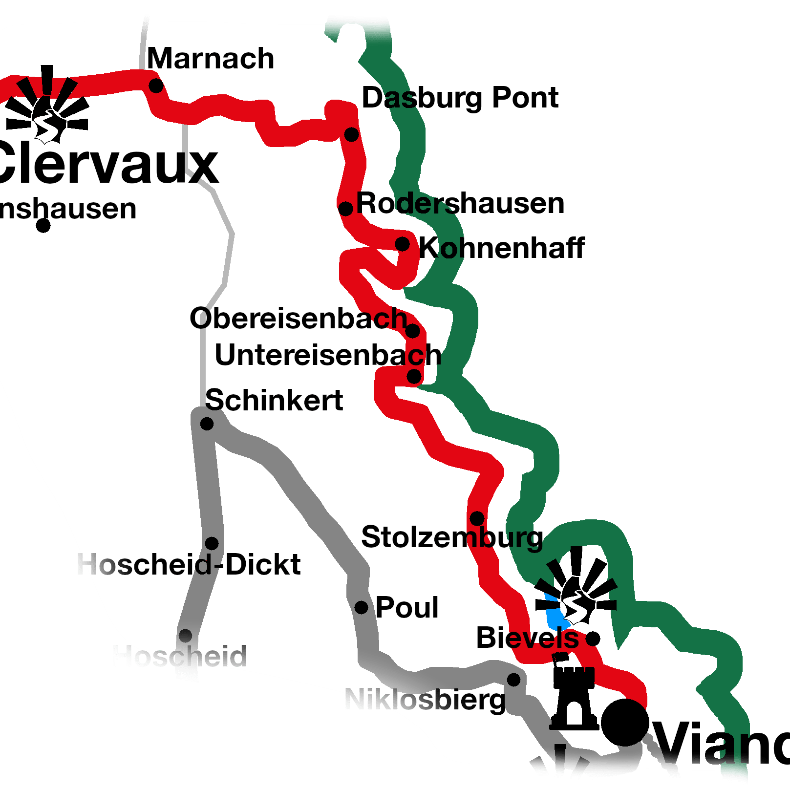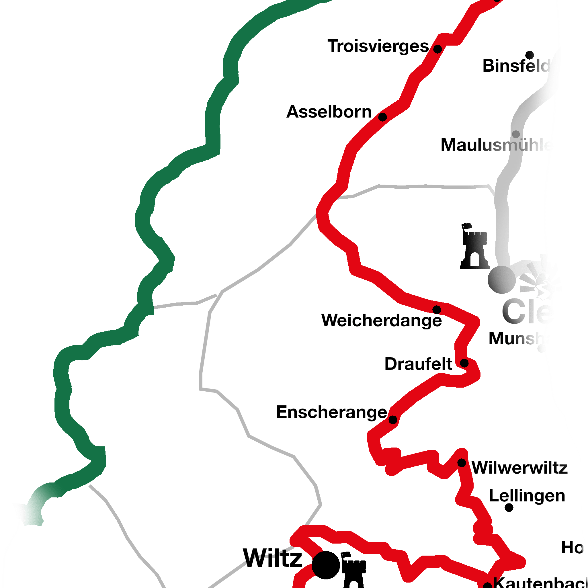 - Die Strecke führt durchs Ösling (Teil der Ardennen) mit zwei Naturparks, mittelalterlichen Burgen und Schlössern, malerischen Dörfern, endlosen Wäldern und tiefen Flusstälern.